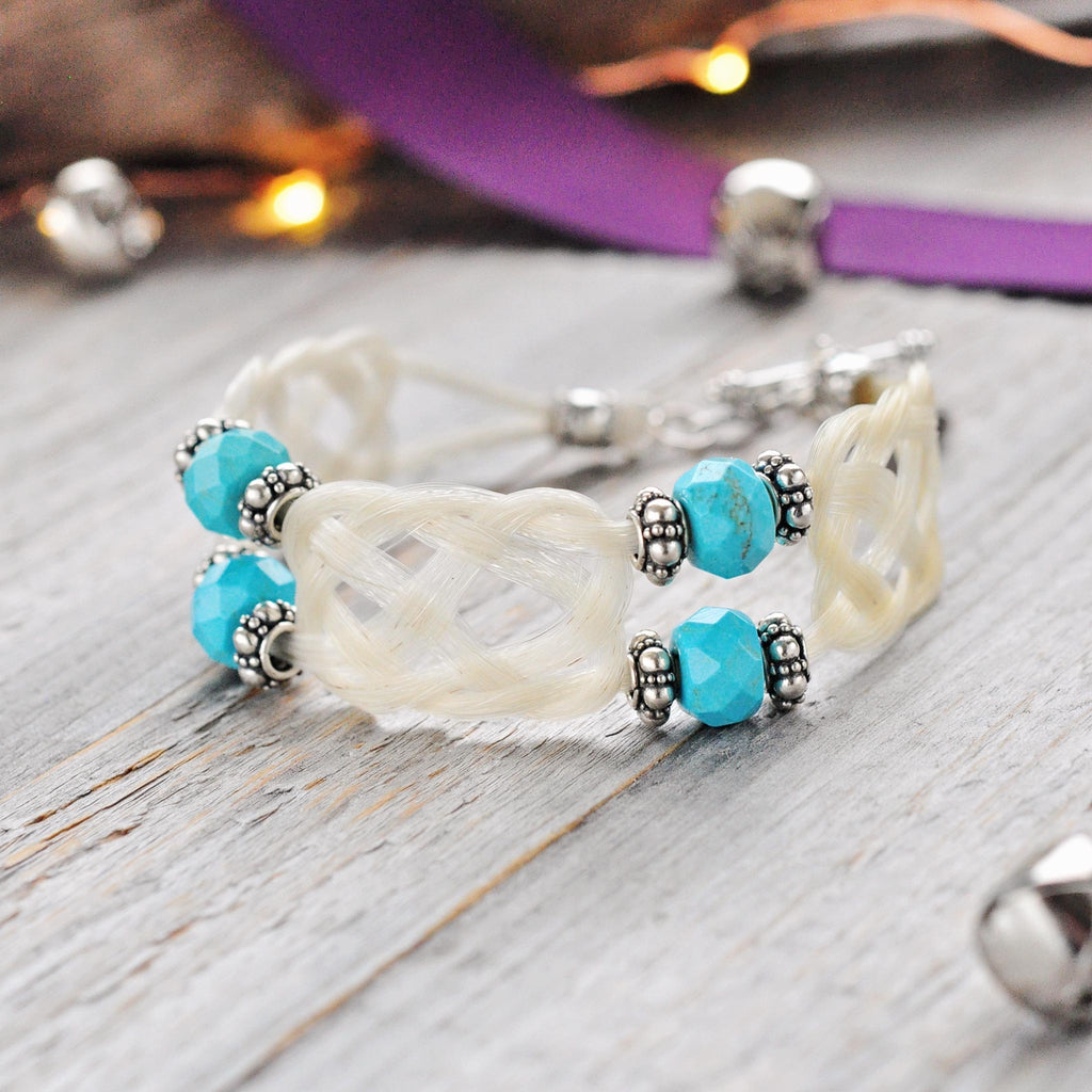 Celebrate your special day with this bold and beautiful Celtic knot horse hair bracelet, complete with sterling silver and turquoise beads. Crafted from a single strand of your horse's hair, or mine, this unique equestrian keepsake is the perfect way to commemorate your special day.