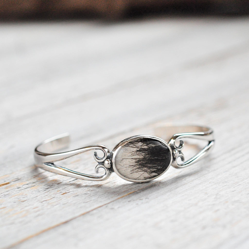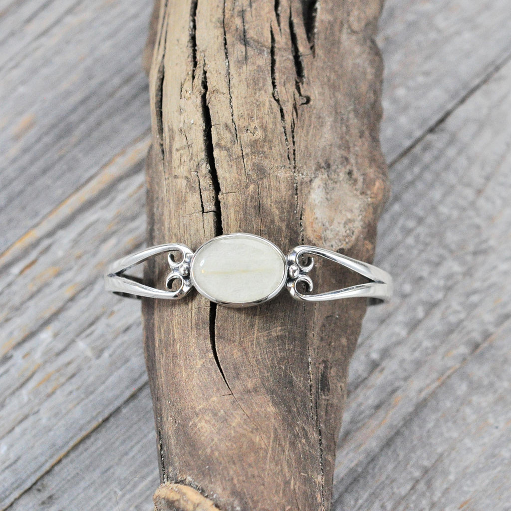 ::  Solid sterling silver cuff bracelet 15 mm wide at glass cabochon.