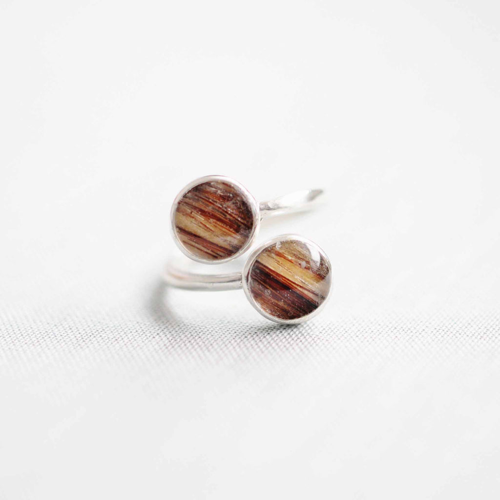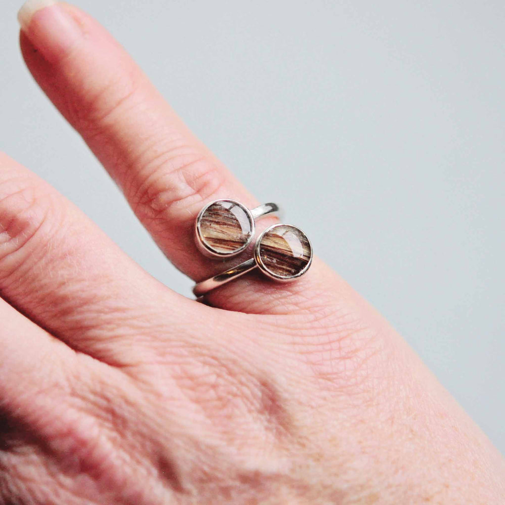 Reach up and touch your heart, and they are right there with you. With two gorgeous horse hair gems this ring is the ultimate in elegant style. Dimensional glazing is used to give the hair sparkle and shine and is finished with glass like resin to protect your horse's hair for a lifetime.