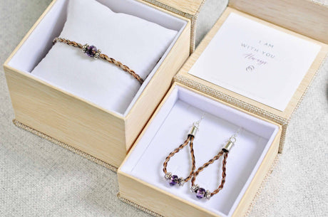 Our popular Sterling Donas Pansy Horse Hair Bracelet + Earrings are hand crafted with your horse's hair (or mine), tightly braided and finished with a faceted purple center bead. Making this horse hair jewelry set perfect for the office or the barn!
